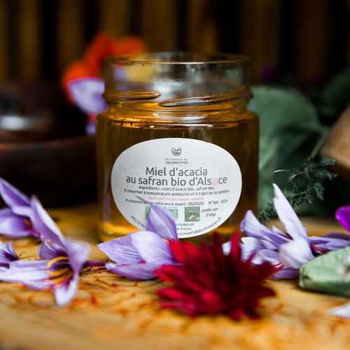 Pour élaborer notre “miel d’acacia au safran bio d’Alsace”, le safran utilisé est bien entendu le safran bio récolté sur notre exploitation, au lieu-dit Lochmatten à Buethwiller ! Le miel auquel nous associons notre safran est un miel d’acacia : très doux et digeste, qui laisse aisément de la place aux notes florales de notre safran. Pour nous fournir en miel, nous travaillons en partenariat avec “Le Rucher des Jardins” situé à Uffholtz, à moins de 25km de notre exploitation ! Le Rucher des Jardins est une petite exploitation engagée dans la démarche de l’agriculture biologique auprès de Certipaq. Découvrez notre miel d’acacia délicatement infusé au safran, un mariage exquis de douceur et de richesse aromatique. Le miel d’acacia, réputé pour sa clarté et son goût délicat, se marie harmonieusement avec les notes subtiles et précieuses du safran. Idéal pour les amateurs de produits raffinés et naturels.
